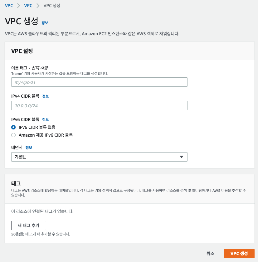 AWS의 VPC 메뉴로 접속하여 생성 버튼을 누른다.