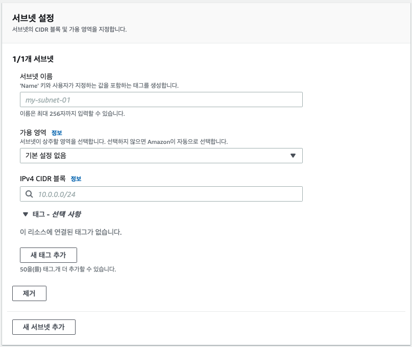 - 서브넷 이름은 용도에 맞게 적당히 넣어주면 된다.