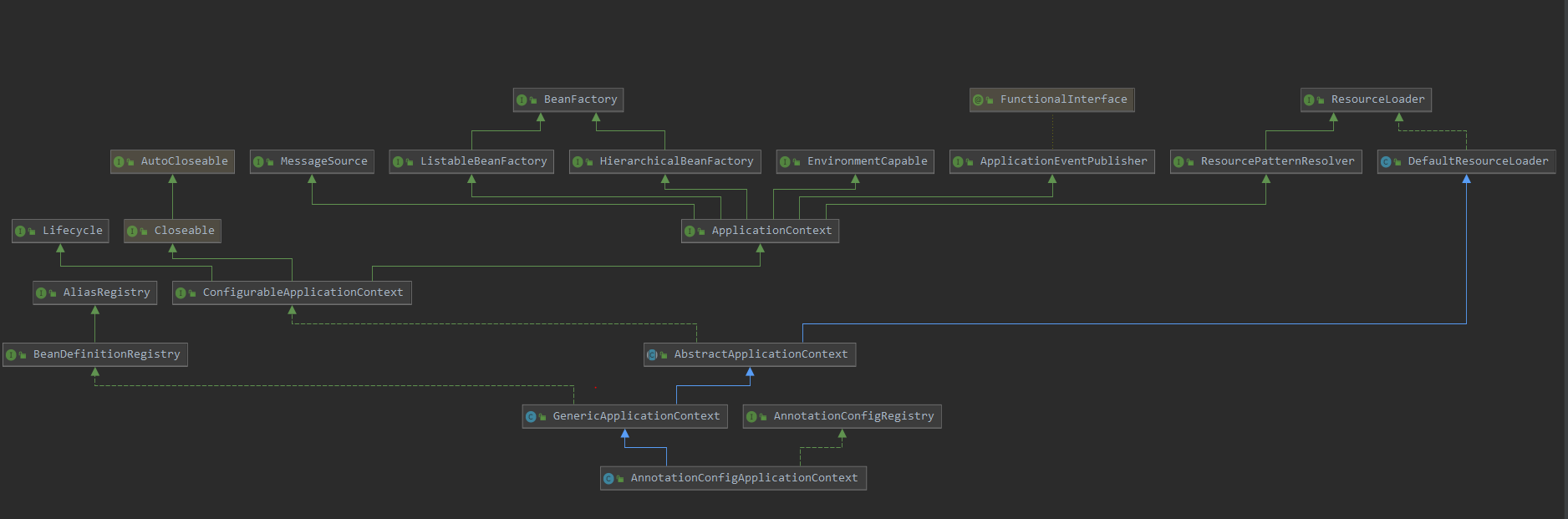 여기서 잠깐 AnnotationConfigApplicationContext의 의존 관계 UML을 확인해보자.