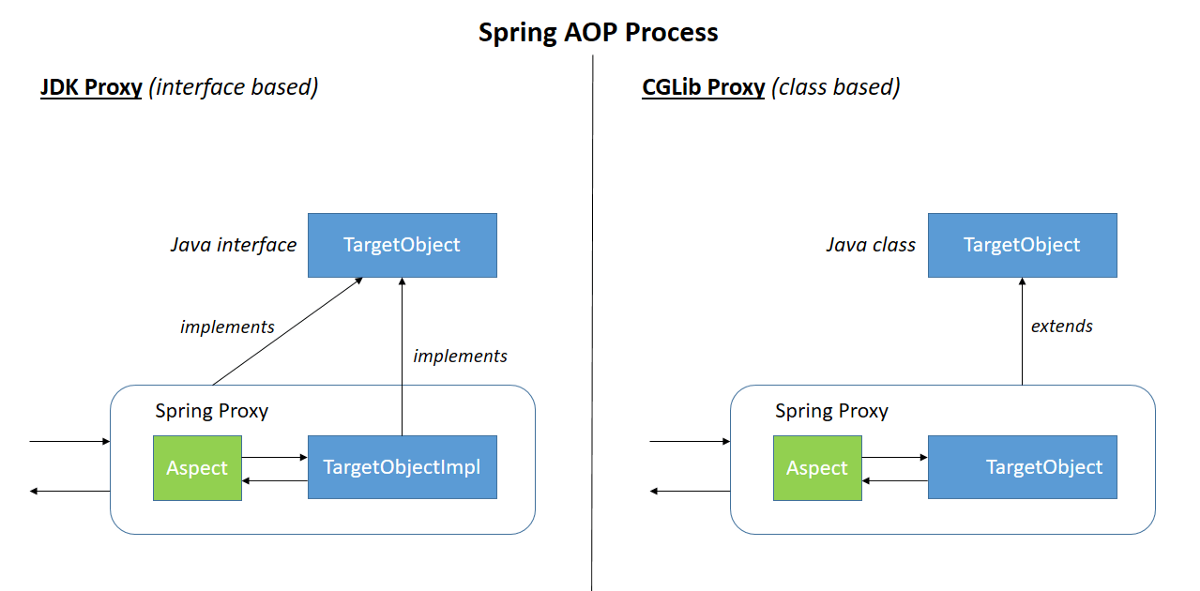 인터페이스를 클래스로 구현하여 사용하는 경우 Dynamic proxy, 단일 클래스는 CGLIB를 사용한다.